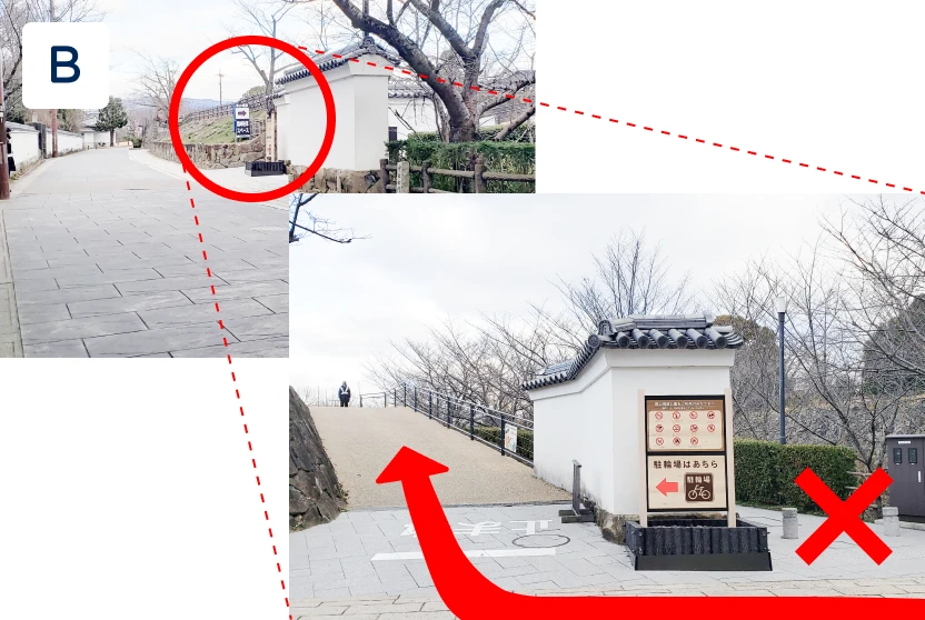 白い壁が右折の目印ですが、手前の×ではなく、奥の矢印の場所で右折してください。退出する自動車が出てきますので、必ず注意して進行してください。