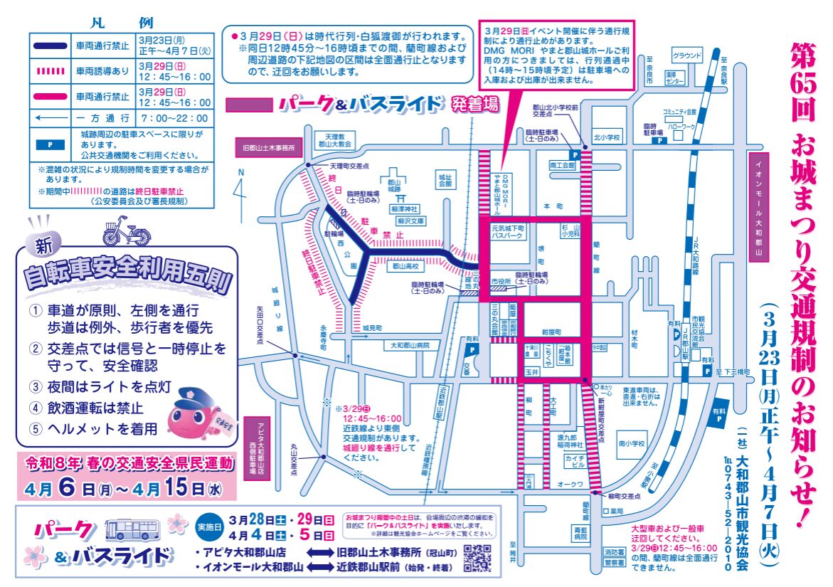 2026年2月25日 交通規制:3月23日(月)正午〜4月7日(火) 【交通規制と公共交通機関ご利用のお願い】 第65回大和郡山お城まつりの開催に伴い、郡山城跡およびDMG MORI やまと郡山城ホール周辺をはじめ交通規制が実施されます。 期間中は周辺道路の渋滞が予想されるほか、一部の駐車場では入出庫ができなくなります。 お越しの際は、スムーズで便利な公共交通機関のご利用にご協力をお願いいたします。 交通規制の詳細は以下のマップでご確認ください。 一覧に戻る Home お知らせ 交通規制:3月23日(月)正午〜4月7日(火)
