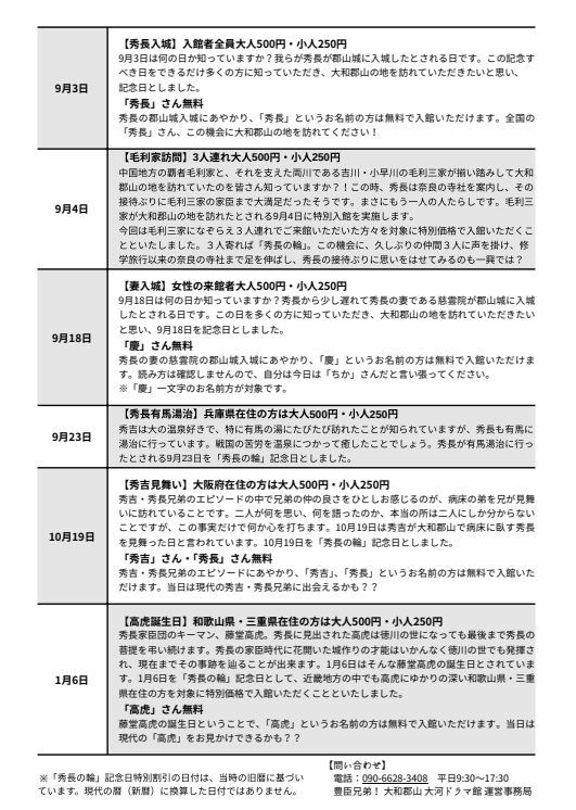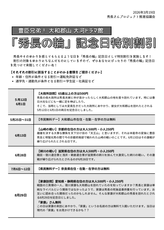 2026年3月20日 大河ドラマ館 「秀長の輪」記念日特別割引 秀長やそのゆかりを感じてもらえるような日を「秀長の輪」記念日として特別割引を実施します!割引の対象もゆかりにちなんだものにしていますので、ぜひあなたにぴったりの「秀長の輪」記念日を見つけて来館してくださいね! 【それぞれの割引に該当することがわかる書類をご提示ください】 年齢・住所が条件となる割引=運転免許証など 通学先・通勤先が条件となる割引=学生証・社員証など 「秀長の輪」記念日特別割引 ダウンロードはこちら 一覧に戻る Home お知らせ 「秀長の輪」記念日特別割引